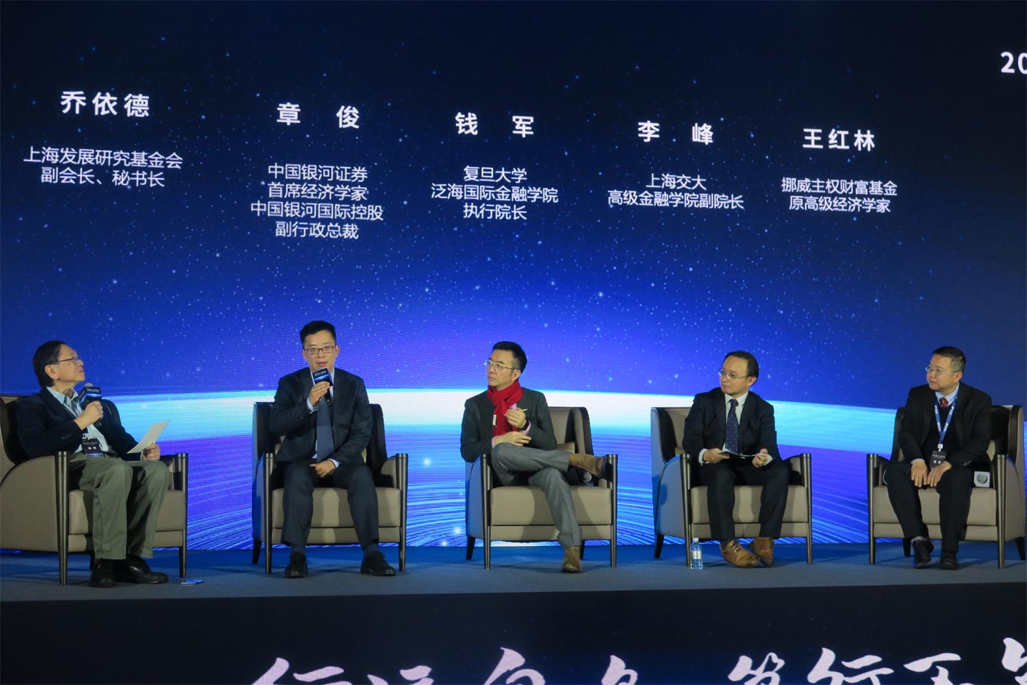 左起,上海发展研究基金会副会长兼秘书长乔依德主持,中国银河证券首席经济学家章俊、复旦大学泛海国际金融学院执行院长钱军、上海交大高级金融学院副院长李峰、挪威主权财富基金原高级经济学家王红林,在刘元春主旨演讲后,就全球经济、股市、数据资产入表、房地产做了分享和讨论(来源:《文汇报》 2023年12月15日 网页版)