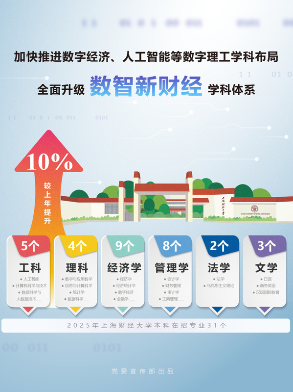 近年上财加快推进学科专业优化调整进程,2025年在招本科专业中授予理学学位专业4个,授予工学学位专业5个,占比30%,比上年提升了10个百分点。